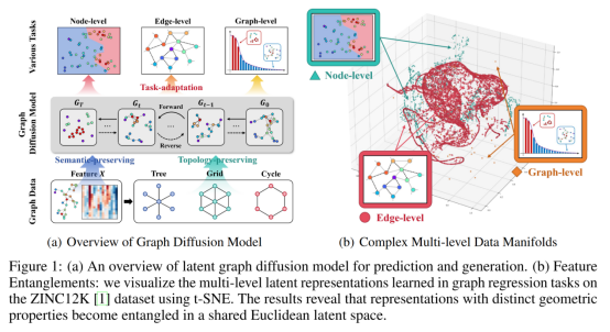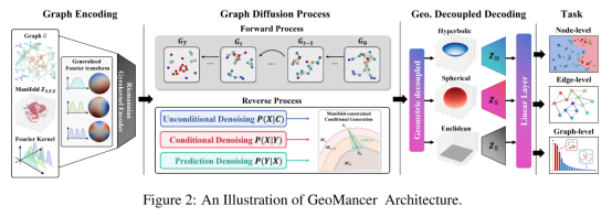 图扩散模型在学习结构化图数据方面取得了显著进展,并在预测任务中展现出强大的潜力。现有的方法通常将节点、边和图级特征嵌入到统一的潜在空间中,将包括分类和回归在内的预测任务建模为一种条件生成的形式。然而,由于图数据的非欧几里得性质,不同曲率的特征在相同的潜在空间中相互纠缠,无法释放其几何潜力。为了解决这个问题,本文旨在构建一个理想的黎曼扩散模型,以捕捉复杂图数据的不同流形特征并学习其分布。这一目标面临两个挑战:编码过程中由指数映射引起的数值不稳定性和扩散生成过程中的流形偏差。为了解决这些挑战,本文提出GeoMancer:一种用于生成和预测任务的新型黎曼图扩散框架。为缓解数值不稳定性,本文用等距不变黎曼陀螺核方法替代指数映射,并将多级特征解耦到各自特定任务的流形上以学习最优表示。为解决流形偏差问题,本文引入流形约束扩散方法和无条件生成的自引导策略,确保生成的数据与流形特征保持一致。大量实验验证了本文方法的有效性,表明其在各种任务中均表现出色。
