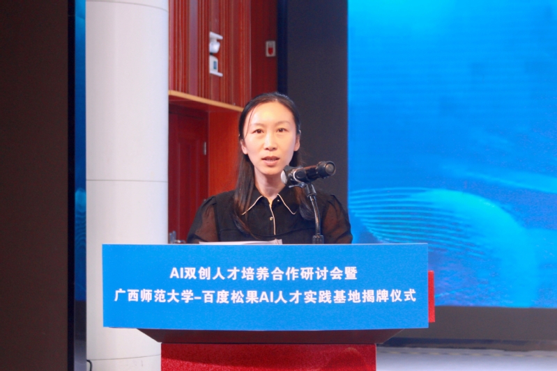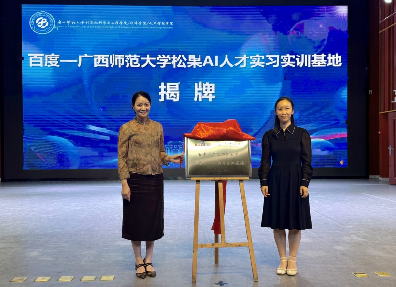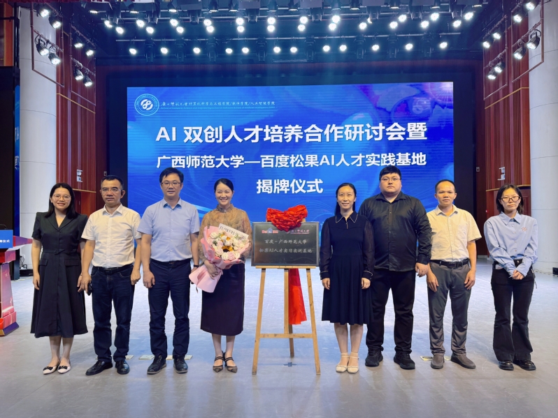 在与会嘉宾的见证下,计算机学院党委主要负责人和计湘婷副总监共同为“百度-广西师范大学松果AI人才实习实训基地”揭牌。该基地将聚焦课程共建、项目实践、技术交流与赛事赋能,为学生提供从理论学习到产业实战的全链条成长支持。