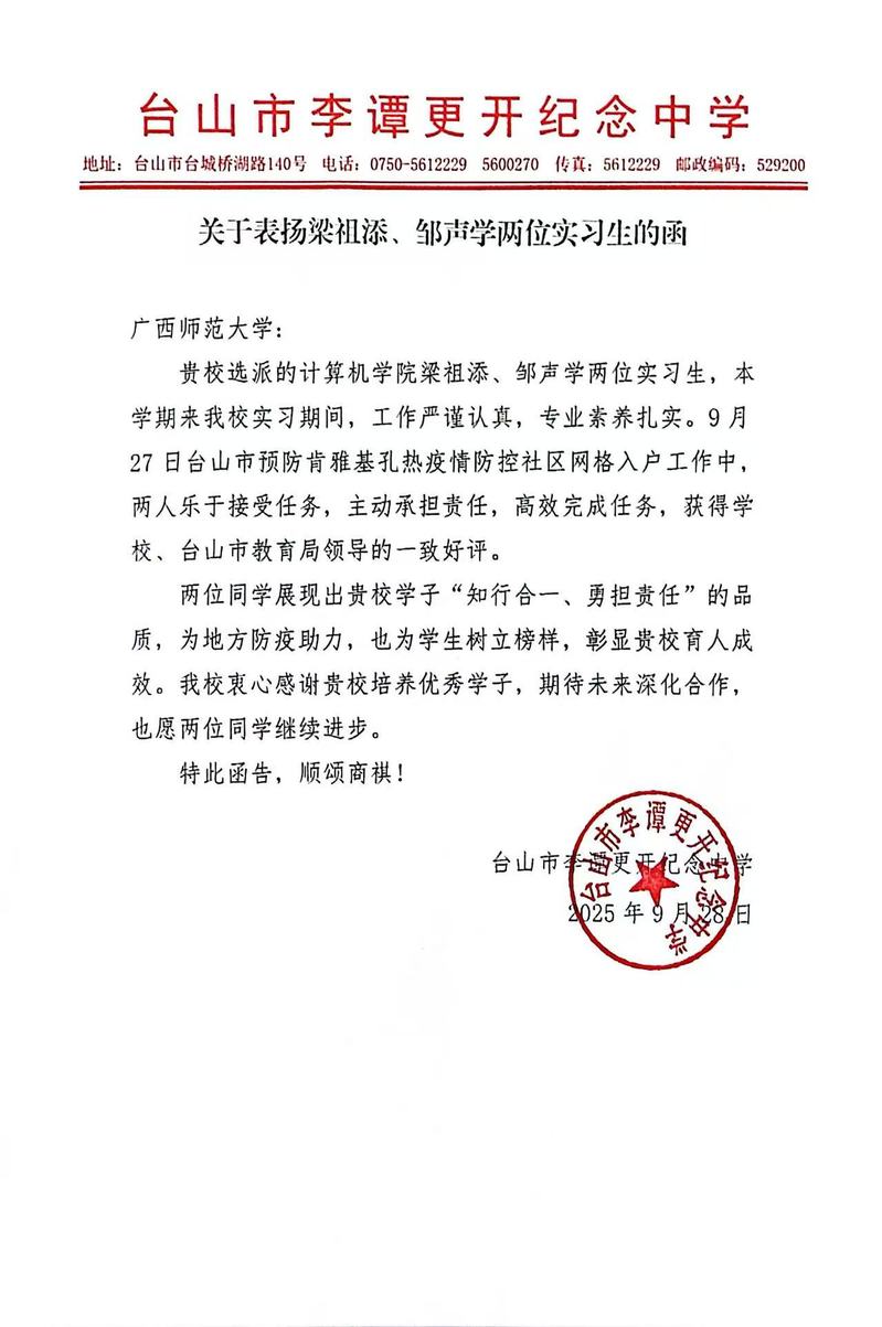 近日,学院收到广东台山市李谭更开纪念中学发来的表扬函,充分肯定了我院2022级软件工程专业梁祖添、邹声学两位本科生在该校实习期间的优异表现。