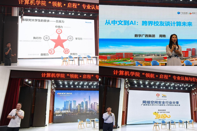 为深化学生专业理解,洞察行业前沿动态,10月17日下午,计算机学院在雁山校区音乐学院三楼报告厅举办“领航·启程”专业认知与行业视野开拓活动。东软教育科技集团有限公司、数字广西集团、移远通信桂林研发中心、奇安信科技集团股份有限公司有关负责人受邀参会,学院分管教学相关负责人及师生代表共计500余人参加活动,活动由学院党委相关负责人主持。