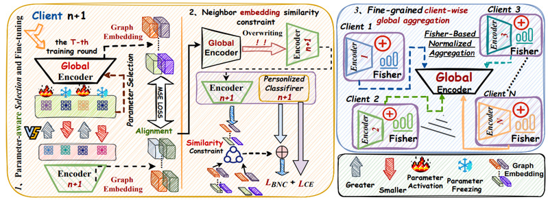 联邦图分类已成为一种很有前景的范式,用于在分布式客户端上进行隐私保护的图学习。然而,真实的联邦场景通常会遭受严重的数据异构性和标签噪声的影响,这显著降低了模型的性能。为解决这些挑战,我们提出了一个鲁棒且个性化的联邦图神经网络框架 FedRog,它能在非独立同分布(Non-IID)和有噪声标签的设置下提高模型的泛化能力。FedRog 引入了一种参数感知(parameter-aware)的选择与微调机制,用于对齐全局和局部表示,以及一个邻域嵌入一致性约束来增强对噪声监督的鲁棒性。此外,我们采用了一种基于 Fisher 信息的细粒度、重要性引导的全局聚合策略,以减轻来自低质量客户端的不可靠更新。我们在五种异构数据划分设置下的 16 个图分类数据集上进行了广泛实验。结果显示,FedRog 在干净和有噪声的条件下,无论在准确性还是鲁棒性方面,与 14 个基线方法相比,均能持续取得具有竞争力或更优越的性能。