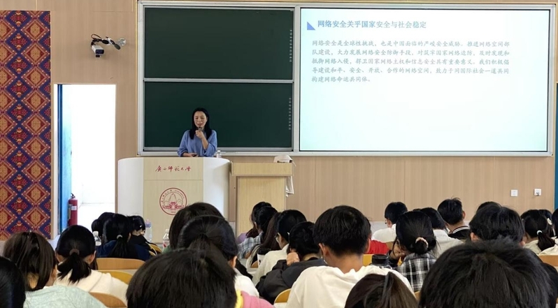为深入贯彻执行党的网络安全战略部署,切实提高新生网络安全意识,规范文明上网行为,11月14日下午,计算机学院在雁山校区文科楼108教室成功举办“网络安全与文明上网”主题公开课。本次公开课特邀计算机学院彭红艳副教授主讲,全体2025级本科新生参加此次公开课。