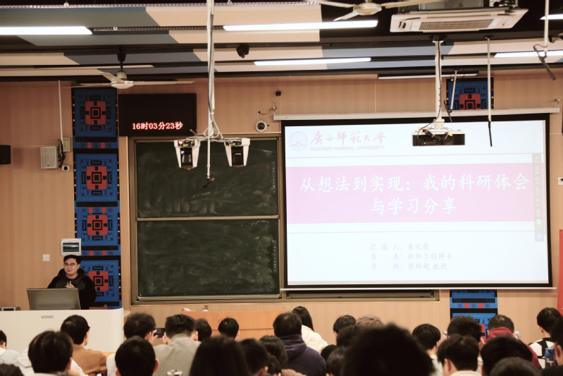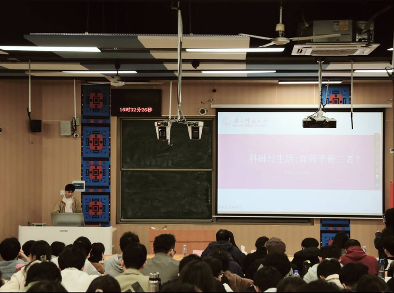 分享会上,黄之荣同学以《从想法到落地:我的科研体会与学习分享》为主题,系统性地拆解了完整的科研工作流程。他详细阐述了如何从一个初步的灵感或想法出发,进行深入的文献调研与可行的课题构思;随后,他分享了在代码实现与实验验证过程中克服困难、优化方案的实战经验。其分享内容环环相扣,为同学们提供了一份宝贵的“科研路线图”。程仕超同学以《科研与生活:如何做到平衡二者?》为题,他结合自己的硕士生活,分享了如何在紧张的科研任务与个人生活、兴趣爱好之间找到平衡点,给大家分享了高效的时间管理方法、压力调节技巧以及保持积极心态的秘诀。