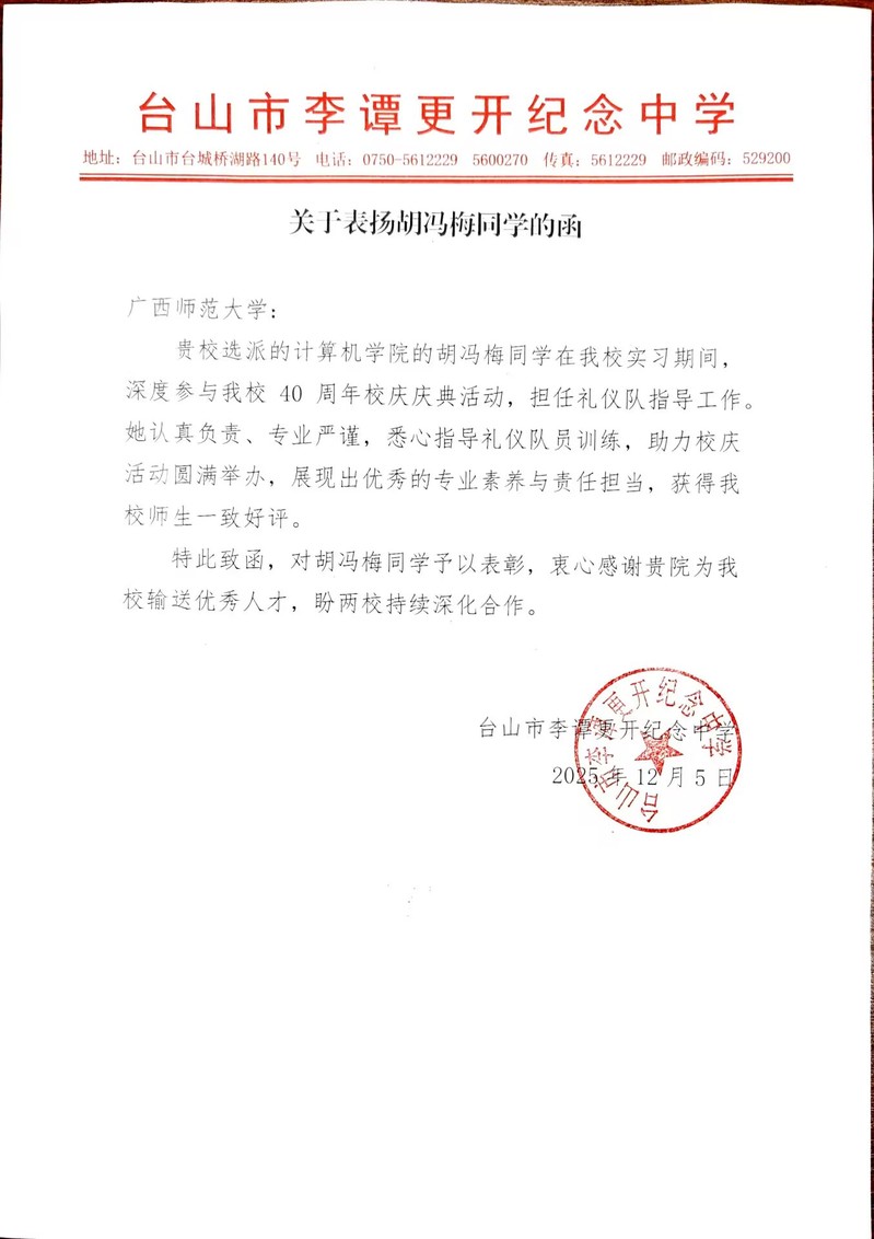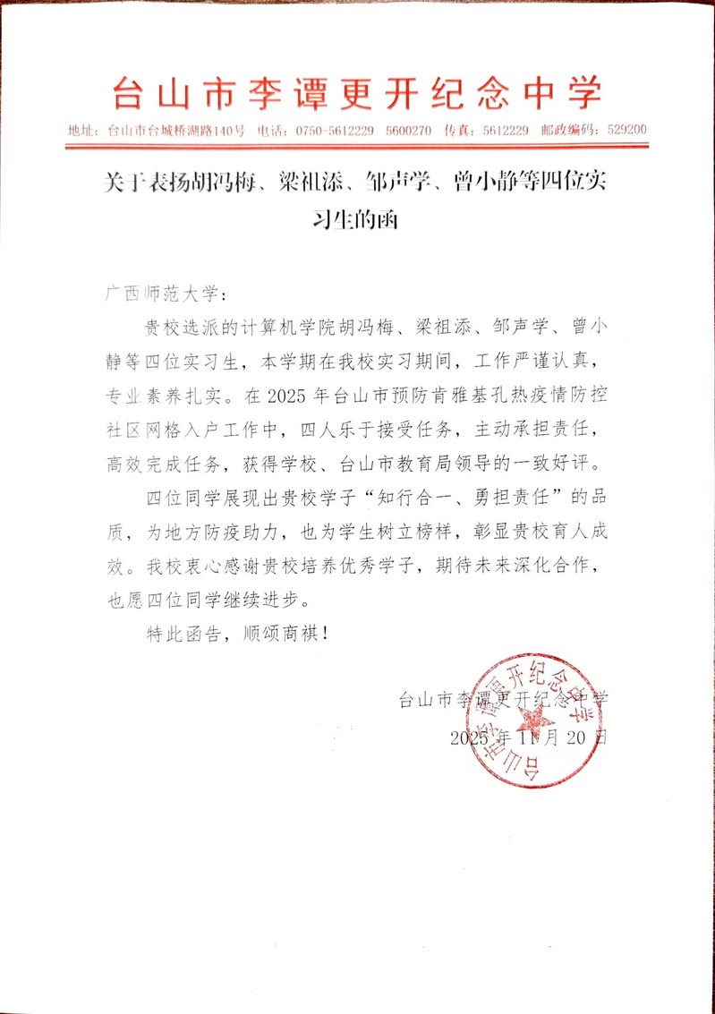 在近期完成的实习实践中,我院2022级本科学生胡冯梅、梁祖添、邹声学、曾小静四位同学,在广东省台山市李谭更开纪念中学实习期间,表现突出,获得了实习单位的高度认可与来函表扬。