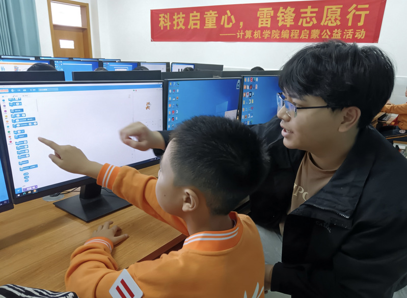 同时,学院志愿者走进雁山金雁学校,开展“科技启童心,雷锋志愿行”少儿编程启蒙志愿服务活动。通过趣味讲解与互动教学,引导孩子们动手实践,展现了计算机学子服务社会的责任担当。